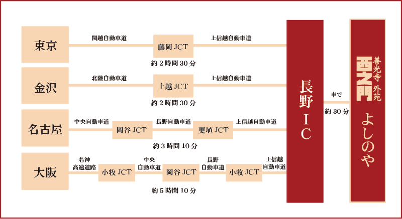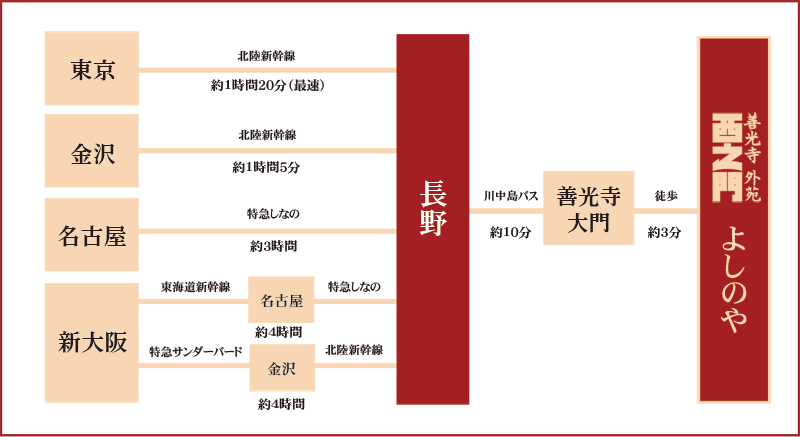 JR長野駅から川中島バス善光寺方面行にのり、善光寺大門下車。徒歩3分。